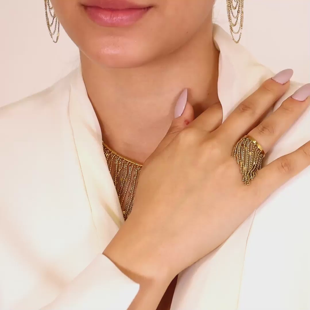 El Anillo Rainfall Drizzle es un diseño audaz en acero quirúrgico de primera calidad con acabado dorado pulido. Su delicado estilo de mini cadenas, inspirado en la lluvia, aporta un toque femenino y sofisticado ideal para noches y eventos especiales. Hipoalergénico y resistente al agua, este anillo vanguardista combina estilo y durabilidad para quienes buscan una pieza espectacular que marque la diferencia con actitud y elegancia.