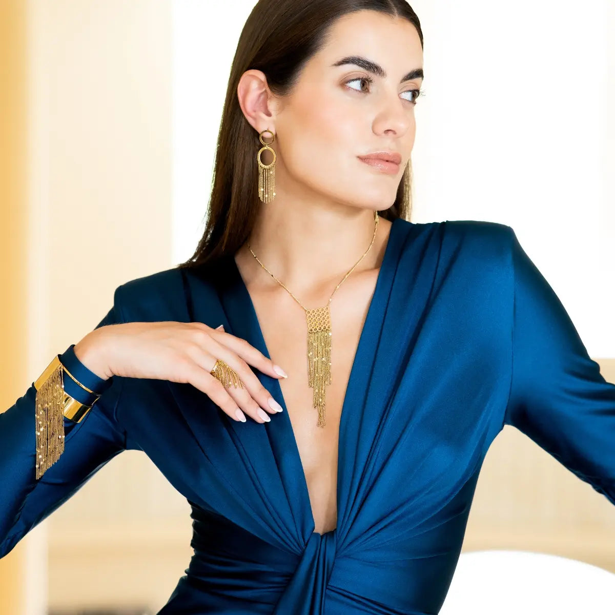 Deslumbra con el conjunto Rainfall, joyas doradas de diseño sofisticado, compuesto por unos Collar Rainfall Glide , Pendientes Rainfall Aura, Pulsera Rainfall Nimara y Anillo Rainfall Drizzle, todo con el mismo acabado vibrante. Cada pieza combina líneas modernas con un movimiento ligero que capta la luz en cada gesto. Perfecto para eventos, galas y ocasiones especiales, este conjunto realza el porte y la feminidad con un estilo contemporáneo y lleno de carácter.